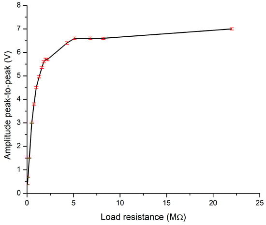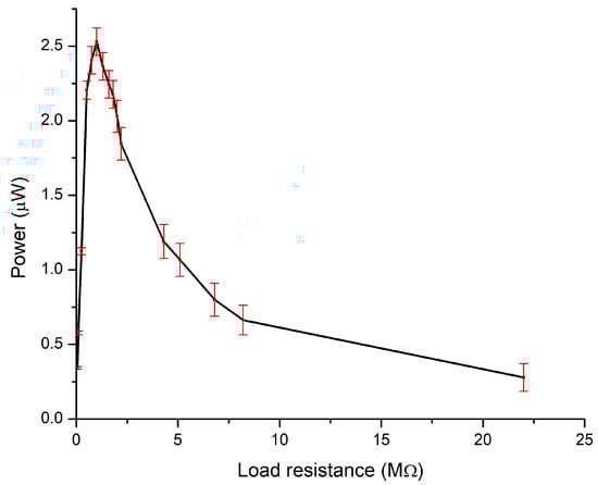 Next, we move on to measure the 5p2s group’s performance, at different electrical loads (tolerance of 0.01%); the results are illustrated in the following two graphs, shown in Figure 10 and Figure 11, respectively. The mechanical excitation was performed at 465.3 Hz (resonant frequency of the grouping) and an acceleration of 1 g. The impedance of the oscilloscope probes was taken into consideration for these representations. The plot in Figure 10 shows the peak-to-peak amplitude of the grouping versus a few discrete resistive load values, and in Figure 11 its calculated power is shown. The maximum value for the collected power was 2.53 µW for an optimal load resistance of 1 MΩ. In this case, the normalized power density of the device is 0.215 µW/mm3/g2, for the unpacked device without the vibration volume.