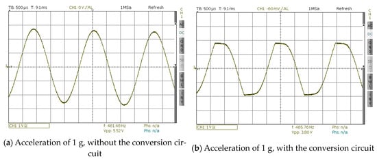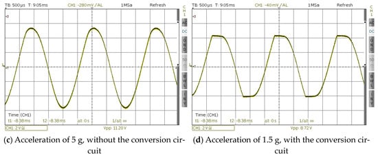 At an acceleration of ~1 g, the 5p2s group’s open load peak-to-peak amplitude is 5.52 V (Figure 13a). When we connect the device to the storage and power circuit, between PZ1 and PZ2 (Figure 12), the peak-to-peak amplitude drops to 3.8 V (Figure 13b). Therefore, we had to increase the acceleration in order to compensate for this drop-off. At an acceleration of ~1.5 g, the 5p2s group’s peak-to-peak amplitude is 11.20 V which drops to 8.72 V when we connect it to the circuit (Figure 13c,d). Even though the value of 8.72 V was enough to start the power circuitry, we had to increase the acceleration even further to reach a stabilized voltage of 1.8 V.
