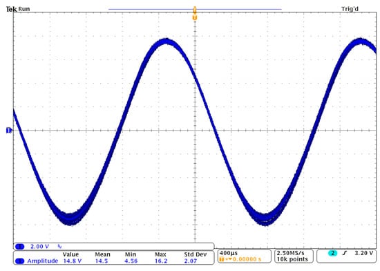 The target for the fabrication of this device was to obtain a useful stabilized voltage. For this, we used the circuit described in sub-paragraph 3.5 and Figure 12, under ‘no load’ conditions (except oscilloscope probe loading) and using only the oscilloscope probes for measurements.