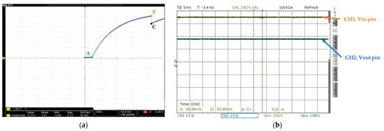 (a) The charging curve for the input capacitor, C1, 1 V/div and 100 s/div: point A–start charging, point B–threshold voltage and transfer to the output capacitor, point C–start charging again; (b) the oscilloscope capture for a stabilized output voltage of 1.8 V on the Vout pin.