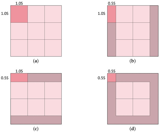 S, is 256. The first cropping starts from the top left corner (1,1). The 768 × 768 image can be divided into nine smaller images without residuals. The second cropping needs to move half an input size along the x-axis, starting from (128,1). The third cropping moves half an input size along the y-axis, starting from (1,128). Both the second cropping and the third cropping can obtain six smaller images. The fourth cropping moves half an input size along both the x-axis and the y-axis, starting from (128,128). (