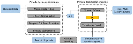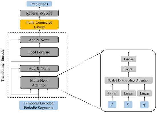 Here, represents the position within the sequence, and i denotes the dimension index. Each position in the input sequence receives a unique positional encoding. The dimension of the model, , is set at 316, which also corresponds to the dimension of each embedding. The output dimensions remain identical to those of the input. These segments, termed temporal encoded periodic segments, are subsequently fed into the Periodic Transformer Encoder.