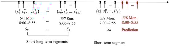 Periodic segment is extracted from the preprocessed historical data, where d denotes the day prior to the current time, ranging from to . The set S is thus composed of these segments, , which include one short-term segment and seven corresponding week-long short long-term segments. For instance, if the current time is 8:00 A.M. on May 8, and the goal is to predict travel times for the next hour from 8:00 to 8:55 A.M., covers the one-hour period immediately preceding the current time. Specifically, includes traffic data from 7:00 to 7:55 A.M., sampled at 5 min intervals. Conversely, the short long-term segments to represent the same one-hour period, each containing twelve time points from 8:00 to 8:55 A.M. Each corresponds to the same hour on the days leading up to the prediction day, stretching back from May 7 to May 1. For a visual explanation of how these segments are structured, refer to Figure 2. These segments, , are aggregated into a periodic tensor S with dimensions . The dimension 96 represents the total number of one-hour time points across all segments, with each containing 12 time points capturing hourly traffic data. The second dimension, 316, is a 316-dimensional vector representing various traffic-related metrics and temporal attributes for each time point. The aggregated periodic tensor is embedded with temporal positional information, resulting in a component termed the temporal encoded periodic segment. This step delivers important information to the model about the sequence order, employing Positional Encoding techniques, as described in [33]. Positional encoding is applied to the input embeddings at each position using sine and cosine functions of different frequencies: