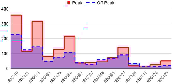 To further illustrate performance under varying traffic densities, experimental results are segmented into two time categories: peak and off-peak. Peak hours, defined as intervals from 7:00 A.M. to 9:00 A.M. and 3:30 P.M. to 7:30 P.M., capture the typical rush hours and are contrasted against less congested off-peak periods. This segmentation helps address the expected greater variability during peak periods due to regular traffic patterns and random events such as accidents, visually supported by Figure 4.