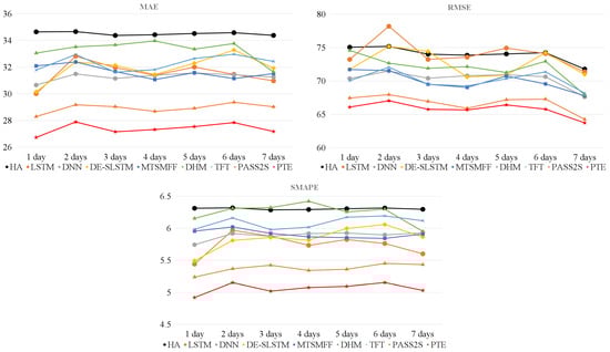 For the 1-day-ahead prediction, PTE leads with robust performance, effectively utilizing prior data to achieve the lowest MAE and RMSE scores, demonstrating its precise grasp of immediate traffic conditions. From 2-day to 7-day forecasts, PTE maintains lower error rates, highlighting its consistency in adapting to daily changes, including weekday and weekend variations. While models such as DE-SLSTM and PASS2S are designed to handle long-term dependencies, PTE consistently outperforms them and other advanced models such as MTSMTT, DHM, and TFT, illustrating its superior capability in long-term forecasting. PTE’s performance remains notably reliable across the entire week, demonstrating its strong predictive performance and adaptability in varying traffic conditions.