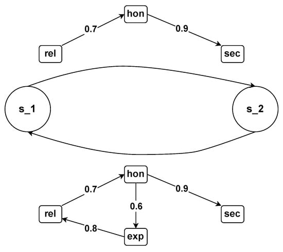The network (upper part of Figure 1) informs us that the smart object derives the honesty of from the reliability by using the derivation rule (represented by the number in the upper part of Figure 1). In other words, if knows the reliability of , it automatically trusts the honesty of as a percentage of the reliability equal to the 70 percent. Therefore, the smart object sufficiently believes the honesty of , even in cases where it has not directly experienced such honesty, provided that the reliability of has been verified.