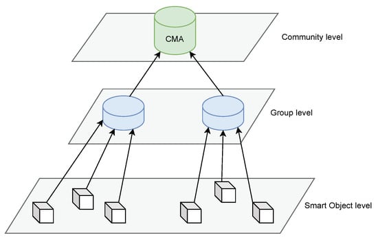 - A group level, composed of lgroup manager smart objects , where each is associated with the corresponding group of and is capable of computing the group reputation for all the smart objects and for all the trust aspects , by applying the automated rules described in Section 4.1 considering only the smart objects ;