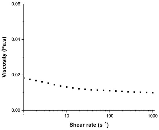 Inks were formulated using different viscosity and surface tension modifiers such as glycerol whose role was to increase the viscosity [41], ethylene glycol equally was used to increase the ink viscosity [42], and propan-2-ol and ethanol which were expected to decrease the surface tension [43]. The surface tension of inks was measured with a manually calibrated Digidrop apparatus using the pendant drop measurement method (Young Laplace model). Viscosity was measured with an MCR302 rheometer provided by Anton-Paar. A cone–plane geometry (known as CP50-2°) with a 50 mm plate diameter and a 2° angle cone was used to determine the viscosity of the inks and solutions. Viscosity measurements were achieved with a shear rate ranging from 1 to 1000 s−1. As presented in Figure 1, for an ink with AuNPs, the fluid showed non-Newtonian properties with a viscosity that decreased as the shear rate increased. The viscosity was significantly decreasing in the range from 1 to 10 s−1, and then slightly decreasing from 10 to 1000 s−1. The viscosity value mentioned in the next sections will be calculated using the average from the 15 points measured between 10 and 1000 s−1.