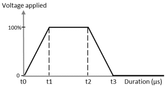 Printing parameters were optimized by observing the droplet behavior through the drop-watcher camera until obtaining homogeneous, round, and stable jetting. Firstly, a trapezoidal waveform was used to stimulate the piezoelectric element to increase pressure on the ink tank, which led to the ejection of the droplet through nozzles (Figure 2). Then, the voltage and temperature were modified in order to obtain satisfying jetting properties. The jetting optimal parameters are discussed in the Results section. Optimal settings like frequency of jetting, distance between nozzles and platen or nozzles (Tn), and platen (Tp) temperature were fixed after being determined; these values are 5 kHz, 1 mm, Tn = 35 °C, and Tp = 50 °C, respectively.