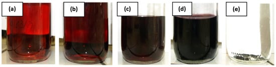 Gold nanoparticle solutions synthesized with different gold concentrations of (a) 0.25 mmol·L−1, (b) 0.49 mmol·L−1, (c) 1.5 mmol·L−1, (d) 3.3 mmol·L−1, and (e) 6.4 mmol·L−1.