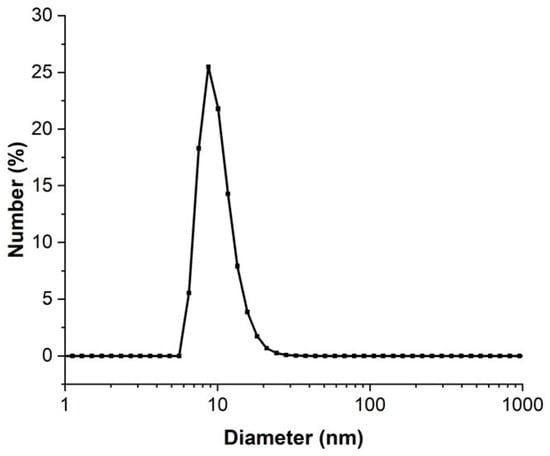 The concentrated 3.3 mmol·L−1 AuNPs that were obtained were analyzed using DLS to determine the particle distribution in liquid media. The DLS diameter distribution presented in Figure 4 shows that the AuNPs in solution have a mean diameter of 8.5 nm and 95% of these particles have a diameter inferior to 20 nm. By increasing the concentration of the AuNP solution, the mean diameter and the size dispersion were increased. The mean diameters were 5.5 nm and 8.5 nm for the less-concentrated (0.25 mmol·L−1) solution and the most concentrated solution (3.3 mmol·L−1), respectively. The diameter obtained by analysis in number was different from the real NP diameter because some approximations such as refractive index (which depends on the AuNP size) were made [44]. Moreover, the DLS method fundamentally requires the analysis of an extremely diluted solution [45], which was not necessarily compatible with our experimental conditions. This is why DLS data must be consolidated with another diameter characterization technique.