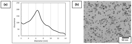 TEM was therefore used to determine the aspect and diameter of dried AuNPs deposited on the Cu/C TEM grid. The diameter was obtained by image analysis of more than 800 AuNPs made with ImageJ software (1.53t version), as can be seen in Figure 5a. An example of a TEM image used for plotting the distribution of diameter is presented in Figure 5b. The AuNP mean diameter is 6.5 nm and the diameter range of AuNPs varies from 2 nm to 15 nm, which is in accordance with the DLS measurements. It is considered that <2 nm diameter particles are artifacts due to the data processing method. These values are superior to the value provided by Piella et al. [40], which is explained by the modification in the synthesis to increase the AuNP solution concentration.