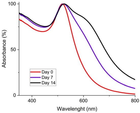 UV-Vis spectrum for 3.3 mmol·L−1 AuNP solution at different aging times with fresh AuNPs (red), after 7 days (purple), and after 14 days (black).