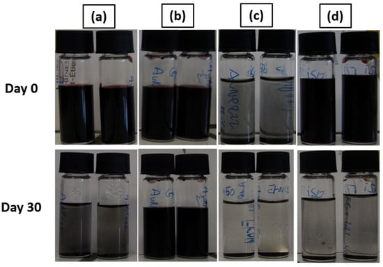 The stability of the mixture made of the AuNP solution and the surface tension and viscosity modifier was evaluated and is shown in Figure 7. AuNP solutions can be seen in Figure 7a and were stable after synthesis. However, these AuNP solutions tended to slowly destabilize, as shown previously by the UV-Vis data. Figure 7b corresponds to the AuNP solution mixed with 55% wt. of glycerol. In this case, the solution is still stable after 30 days. This behavior is also shown by the UV-Vis spectrum presented in Figure 7a. The viscosity increase is supposed to be responsible for the improved stability of the mixture. The addition of a surface tension modifier such as propan-2-ol, 50% wt. here, as shown in Figure 7c, destabilizes the AuNP solution and leads to a rapid sedimentation of the particles within 1 h. Finally, as shown in Figure 7d, an intermediate behavior is observed for the mixture made of AuNP solution, glycerol, and propan-2-ol. The solution tends to destabilize over time and is partially sedimented after 30 days, as could be observed with the AuNP solution. This destabilization behavior is highlighted by the UV-Vis spectrum of the AuNP solution, glycerol, and propan-2-ol mixture shown in Figure 8b. However, no precipitation occurs in a week for this ink.