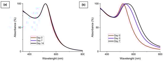 UV-Vis spectrum of (a) 3.3 mmol·L−1 AuNP solution with 55% wt. glycerol addition and (b) 3.3 mmol·L−1 AuNP solution with 55% wt. glycerol and 10% wt. propan-2-ol addition at different aging times.