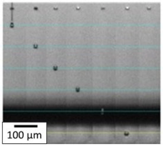 For ink jetting, the trapezoidal waveform has also been used with a maximum voltage duration held for 1.5 µs and zero voltage for 3 µs. The voltage applied was varied to determine the optimal range in values to correctly eject the ink. This value is identified between 24 and 30 V. That is why, as observed in Figure 9, the speed of droplets is at least 4.6 m·s−1, and the tail reattachment is slightly delayed around 200–300 µm which is suitable for the inkjet process. Optimal drop spacing values found were 20 µm DSX and 50 µm DSY. This led to wet patterns with very well-defined edges.