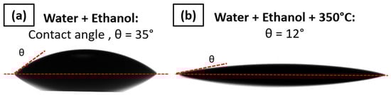 A different type of cleaning method with water and ethanol was tested. The only significant effect in terms of contact angle decrease was obtained by heating the PI substrate at 350 °C for 1 h after the cleaning. This allows the contact angle θ to be decreased from 35° ± 2° to 12° ± 2°, which is suitable for ink deposition; the wettability is shown in Figure 10. Thus, the cleaning followed by thermal heating at 350 °C will be performed before the printing.
