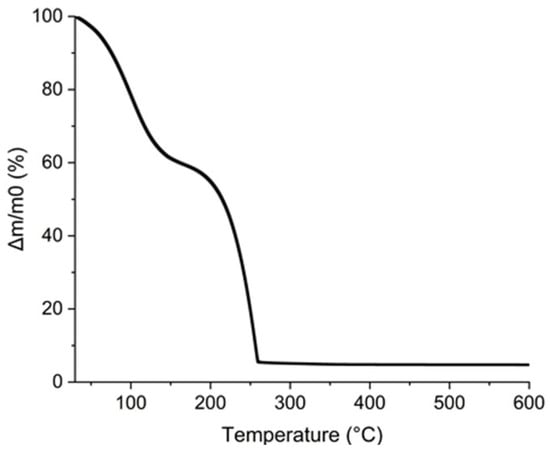 Furthermore, the additives in the ink must be eliminated by a thermal treatment lower than the polyimide degradation temperature. To verify that all the organic parts contained in the ink were removed at this temperature, a TGA analysis was completed and reported in Figure 11. The first mass loss was attributed to the evaporation of propan-2-ol and water near 100 °C. This is confirmed by the calculation of the percentage eliminated. The water and propan-2-ol mass losses observed by TGA are 40% wt. which corresponds to the 45% wt. of AuNPs added to the ink considering that gold loading is 5% wt. The second mass loss from 150 to 260 °C corresponds to the loss of 55% wt. of the ink and was attributed to glycerol for which the boiling point is 290 °C [52]. It is noteworthy that all the organics composing the ink are removed below 260 °C which is compatible with PI substrate.