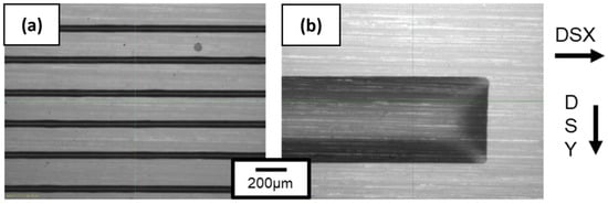 The DSY parameter translates the distance between each line. A DSY value of 200 µm between the lines shows well-separated lines in Figure 12a. By decreasing DSY, the distance is diminished and overlapping starts to occur with a partial coverage of the ink onto the PI substrate. Decreasing DSY to 5 µm leads homogeneous 2D lines being obtained, as shown in Figure 12b. According to previous thermal analysis, all patterns were dried in an oven at 110 °C for 15 min to evaporate most of the solvents like propanol-2-ol and water. A final thermal treatment temperature of 350 °C was made for 3 h with a 2 °C min−1 ramp. These values are in accordance with those referenced in the literature [12].