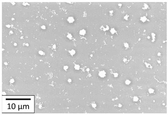 The deposition made of 100 layers and sintered at 350 °C for 3 h was set as the reference for the AuNP coating. Figure 13 shows an SEM image of the deposit that is made of small randomly dispersed AuNP particles. These particles are not interconnected even with 100 layers. This means that the amount of gold deposited is not high enough to obtain a conductive coating on polyimide with 100 layers deposited. The chosen AuNP solution was the most concentrated that had been synthesized before obtaining sedimentation, which means that the concentration cannot be increased. The number of layers is a variable parameter that can allow the amount of gold deposited to be increased. Nevertheless, increasing this layer number will be time-consuming and will result in a decrease in the resolution and maybe the quality of the printed layers.
