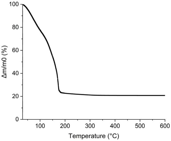 In order to increase this gold concentration, a gold precursor was directly dissolved in propan-2-ol, ethylene glycol, and water mixture. The gold precursor quantity added to the mixture was increased by successive small additions until reaching the most concentrated solution corresponding to 1.6 mol·L−1 of gold salt, HAuCl4·6H2O, in the final ink composition. The rheological and surface tension properties remained at 32 mN·m−1 and 14.0 mPa·s. This 1.6 mol·L−1 precursor ink was further investigated using thermal analysis and the TGA/DSC graph is presented in Figure 14. Mass loss shows that there is a first step before 100 °C where water and propan-2-ol evaporate. Then, between 100 °C and 200 °C, a huge mass loss is observed and completed at 184 °C. This is compatible with the elimination of ethylene glycol occurring theoretically at 197.6 °C [56]. The total mass loss was 80% wt. meaning that the gold loading in the ink represents 20% wt. of the mixture.