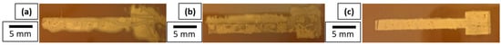 Finally, the deposition technique of precursor ink onto the substrate was optimized to obtain a homogeneous gold coating. It was noticed that multiple layers were necessary to have a thick gold layer. To have well-defined samples, a heating step was performed to remove the solvent excess after several consecutive layers were printed. These evaporation steps were performed at 110 °C for 20 min in an oven followed by a thermal treatment at 350 °C for 2 h. As shown in Figure 15 in the macroscopic pictures, for 40 layers of deposited coating with a drying step every 20 layers (Figure 15a), the ink is spilling out of the pattern area due to solvent excess. This phenomenon is also observed for a 40 layer coating dried every 10 layers, as presented in Figure 15b. By drying every five layers that were printed onto the PI foils, a homogenous layer was obtained with a high resolution and well-defined edges for the 60 layer coating, as shown in Figure 15c.