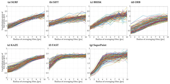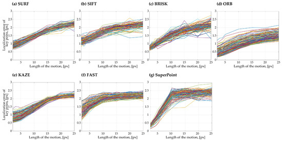 Dependence of key point localization error on the image degradation level. Image degradation is simulated using motion blur, followed by the addition of noise. All key point detectors (SURF (a), SIFT (b), BRISK (c), ORB (d), KAZE (e), FAST (f), and SuperPoint (g)) show increasing localization error as motion blur strengthens. Different colored lines (150 in total) represent the dynamics of localization errors related to separate images. This simulation proves the importance of finding the highest-quality images for photogrammetry reconstruction. It also lays the foundation for the objective evaluation of image quality level through the evaluation of key point localization errors. Therefore, key point localization error can be used to rank augmented images according to their degradation level.