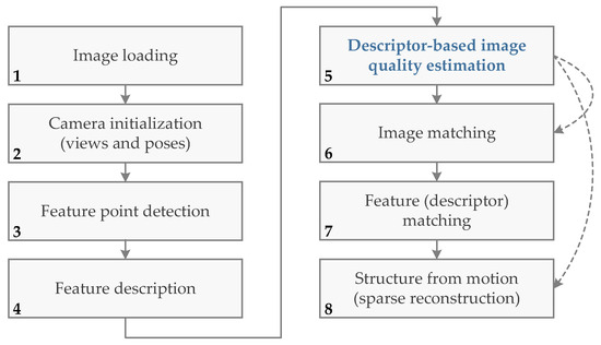 A suitable image selection method for photogrammetry would identify the highest-quality images by evaluating the images or specific regions within them. It would be practical to repurpose feature point descriptors, which are already extracted during the photogrammetric reconstruction process (Figure 4), to derive an image quality score. This score could then be used to rank a group of images based on their quality.
