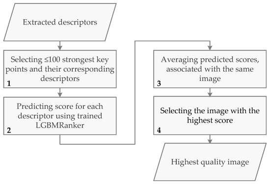 Workflow chart of selecting the highest-quality image from a subset of images. Current workflow elaborates the descriptor-based image quality evaluation (5th step) of the workflow presented in Figure 4.
