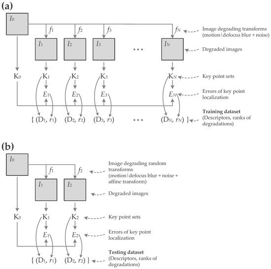 Construction of the training (a) and test (b) datasets by augmenting original images. Here, —original image; , , , , —augmented images using N different image augmentation transforms leading to the degraded images , respectively (transforms include motion blur or defocus blur of various strengths followed by the corruption of Gaussian noise); —sets of extracted key points; —errors of key point localization due to image quality degradation. Errors are used to derive an objective ranking of image degradations (). A fixed number of strongest key points are selected to extract descriptors that serve as input features for the ranker model. Training set (a) is constructed via degrading images using a set of predefined degrading transforms . Test set (b) is constructed by degrading each original image by two randomly selected transforms and .