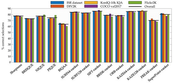 Graphical summary of the experimental results of methods comparison. The results are the percentage of correct selections of the higher-quality image from a pair of images. The color of the bars represents the dataset from which the test results came. A solid line above the bars indicates the overall accuracy of the method. The names of the methods are shown on the horizontal axis. Suffixes “64” and “128” near the descriptor name denote the dimensionality of the descriptor. The proposed key-point-descriptor-based image quality evaluation methods are named by descriptor name and “ranker” suffix.