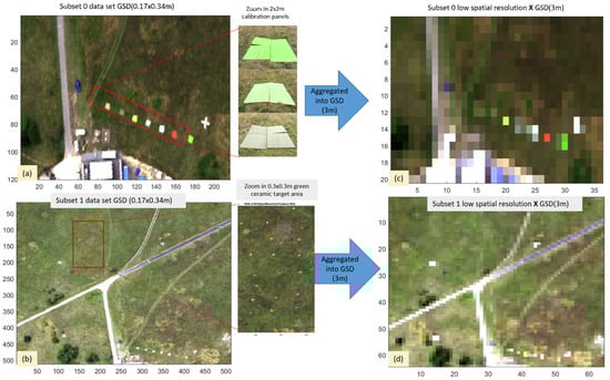 The pseudo-RGB of the GT HSI scene, with GSD 0.17 × 0.34 m for (a) subset 0 and (b) subset 1, and their corresponding aggregated scenes (c,d), respectively, at GSD of ~3 m. The pixel occupancy of the green ceramic tiles as targets in (d) was about 0.015.
