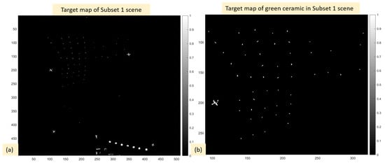 Two subsets of the Selene hyperspectral data [33] were used as the ground truth (GT) for assessing the effectiveness of the sharpening algorithms in this work. The scene was acquired by the HySpex VNIR-1600 hyperspectral sensor over the Porton Down Range (Long 51°8′19.7″ N, Lat 1°39′16.9″ W to 51°7′41.7″ N 1°40′8.5″ W) on 12 August 2014 BST 12:00:04 at an altitude of 4000 ft, with a ground sampling distance (GSD) of about 0.5 m. The scene contains 95% natural materials, such as grass, soil, and trees, with artificial manmade materials, such as ground markers, path, concrete, buildings, and various sizes of colored panels, for calibration and target detection purposes, as the remaining materials in the scene. The scene was radiometrically and atmospherically corrected using QUAC [38], and two subsets of the scene were selected as the ground truth (GT) high-resolution HSI (HRHSI) datasets for the present sharpening work. Subset 0 consists of 7 colored manmade calibration panels in sizes of 2 × 2 m, with backgrounds of bushes, grassland, buildings, and paths. Subset 1 contains mainly grassland but is characterized by having very small ceramic tiles as targets in sizes of 0.2 × 0.2 m scattered around the scene. These two subsets of the scene were then linearly aggregated to a GSD of 3 m to create the LRHSI used in this study. The pixel occupancy of the green ceramic tile targets in the aggregated subset 1 scene was about 0.015. Please refer to [4,33] for more information about the properties of the datasets, such as the experimental settings, design of experiment, control variables, and data selections. The pseudo-RGB of these two subsets and their aggregated scenes are depicted in Figure 1, and the target map of the small ceramic tiles is shown in Figure 2.