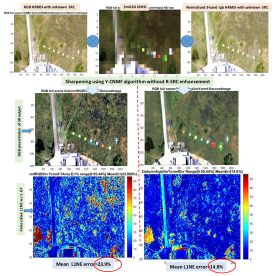 The significance of R-SRF, highlighting the differences in SR accuracy when the 3 m GSD LRHSI (middle top) was fused with two versions of the HRMSI: (Left) the RGB version of HRMSI and (right) the normalized rgb of HRMSI. In both cases, the same algorithm (Y-CNMF) was used for SR, but the L1NE error of the RHS result was half that of the left.