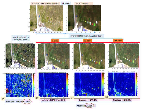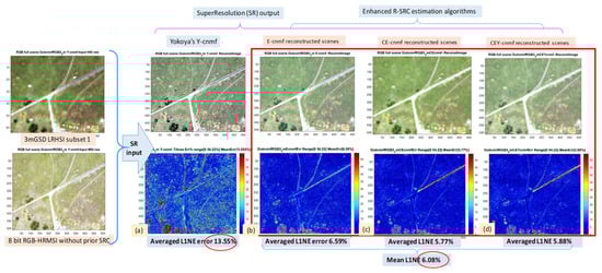 The performances of SR through the fusion of the 3 m GSD LRHSI of subset 1 with the RGB-HRMSI using all SR algorithms proposed in this work. First column: RGB representation of the input datasets. Upper panels (a–d): the RGB representations of the outputs of the four SR algorithms: Yokoya’s original algorithm Y-CNMF, the proposed 3 algorithms in red box: E-CNMF, CE-CNMF, and CEY-CNMF, respectively. Lower panel: the corresponding L1NE w.r.t. the GT for the SR outputs obtained from the four SR algorithms, in which the proposed algorithms (b–d) exhibited a factor of ~2-fold error reduction compared with Yokoya’s original algorithm, shown in (a).