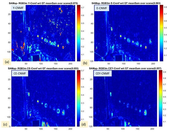 It is of interest to present the results of Figure 5 using SAM, which has been one of the most popular assessment metrics used in SR research over the last few decades [1,2,3,4,5,6,7,8,9,10,11,12,13,14,15,16,17,18,19,20,21,22,23,24,25,26,27,28,29,30,31,32,33]. Figure 5 presents the SAM results for the three SR outputs of the proposed SR algorithms, together with those produced for Yokoya’s original algorithm (Y-CNMF). All are presented in false color maps. The mean of the SAM over the entire scene for the three proposed SR algorithms was about 0.058, which is ~22% better than that of Yokoya’s algorithm (Y-CNMF), while the L1NE assessment that is shown in Figure 4 indicated a ~3-fold reduction of spectral errors for the SR reconstructions by the proposed algorithms. The significant difference between these two assessments may suggest the inadequacy of SAM for assessing the accuracy of SR results, particularly when SR is intended for surveillance or target detection applications (see Section 3.2.2, Section 3.3.2, and Section 3.3.3 for more information).