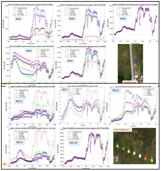 Selection of pixel spectra of the subset 0 scene sharpened by all SR algorithms: (a) natural vegetation and (b) manmade materials. The scene sharpened by Yokoya’s algorithm is plotted in red dots, which are seen to deviate greatly from the ground truth (GT; plotted in blue circles). It can be seen that the proposed algorithms, particularly CEY-CNMF (plotted in magenta triangles), performed much better than Yokoya’s algorithm, with substantially closer spectral resemblance to the GT. The location of the ROI are depicted in the RGB picture of the scene.