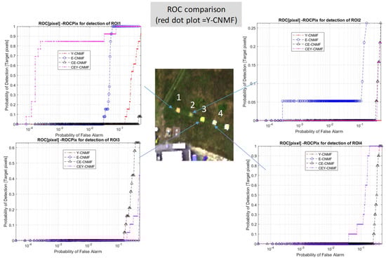 Figure 7 plots the ROC for the detection of several 2 × 2 m calibration panels in subset 0 after the 3 m GSD LRHSI is sharpened by the proposed algorithms. The abundance of the panels in the LRHSI is about 0.44, and the target signatures of the panels were extracted from the GT HRHSI dataset for detection by the ACE (Equation (16)) algorithm. It is seen from the figure that the detection of these relatively large targets in scenes that were sharpened by the proposed enhanced R-SRC CNMF algorithms was far better than what was shown by Yokoya’s original SR algorithm (in the red dot plot). Some panels, such as the target in ROI(1), exhibited a three orders of magnitude false alarm rate reduction, for the same detection rate, compared with Yokoya’s algorithm. The better detection of targets from the scene indicates a more accurate reconstruction of the HRHSI.