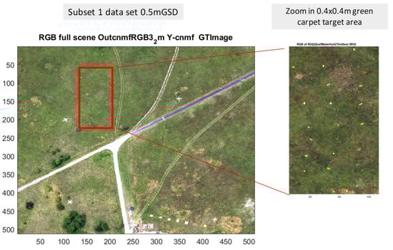 This section examines whether single-pixel-size targets in the 0.5 m GSD HRHSI could be recovered from the aggregated 3.2 m GSD LRHSI scene through the fusion-based SR approach. The aggregated GSD 3.2 m LRHSI of subset 1 contained small green ceramic targets of sizes 0.2 × 0.2 m, which were mixed with the background with effective abundances of about 0.015. The RGB representation of the GSD 3.2 m LRHSI, as shown in Figure 9, appeared to be fuzzy throughout the entire scene, including large structures, such as the road path.