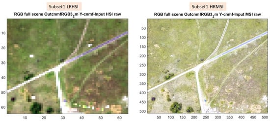 One objective of this work was to assess the capability of parts’ learning techniques, such as NMF, and particularly, whether CNMF is capable of recovering small target pixels with a small occupancy of about 0.015. To achieve this objective, the CNMF process was cascaded into two different levels, with the first one dealing with raw X and Y using the CE-CNMF, as set out in Section 2.2.3 above. The number of columns in E in Equation (4), as determined by the vertex component analysis (VCA) algorithm [36], was small due to the small number of pixels (Nh) and the coarse spectral fidelity in the raw data X, which typically yielded in the order of <40 endmembers in the test scenes that were used in this work. The sharpened result of the first round (X’) contained a substantially larger number of pixels (Nm) with substantially higher spectral fidelity, which induced a larger number of E, typically about 3–4 times higher than that of the first round. Thus, the CEY-CNMF algorithm was deployed as follows: