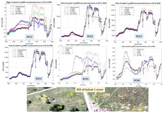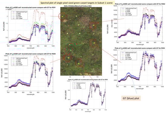 Spectral plots of randomly selected pixels at the location of small green ceramic targets for the subset 1 scenes sharpened by all SR algorithms are shown. It is seen that the sharpened scene processed by Yokoya’s original algorithm (in the red dot plot) exhibited relatively larger spectral discrepancy w.r.t. the GT than those sharpened by the proposed enhanced R-SRC algorithms.