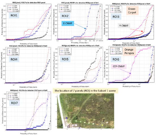 Similar to Section 3.2.2, this section examines the target detection performance for the larger targets in the sharpened scenes of subset 1. There are large 2 × 2 m calibration panels as well as small ceramic tiles of 0.2 × 0.2 m in size scattered around in subset 1. The ROC behavior was interpreted from the ACE detection statistics with respect to the target maps shown in Figure 2, which contain both large and small targets in this dataset. Figure 12 depicts the ROC for the ACE detection of seven manmade calibration panels from sharpened images produced by all SR algorithms used in this work. It is seen that the ROC for some panels, such as the orange and green Perspex (ROI 6 and 3), achieved a several orders of magnitude better false alarm rate, for certain detection rates, for the proposed enhanced R-SRC algorithms, compared with Yokoya’s algorithm. The exact reason why the enhancement of detection was not the same across all different types of targets is not known at present. Figure 13 shows the averaged ROC for all seven targets in subset 1, and it is clear that the proposed two-level CEY-CNMF provided an order of magnitude false alarm reduction in the low probability of false alarm region, compared with Yokoya’s algorithm. The better detection of targets from the scene indicates a more accurate and faithful reconstruction of the HRHSI.