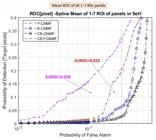 The mean of the ROC for the ACE detection over seven manmade calibration panels as targets. It is seen that the proposed two-level SR algorithm, CEY-CNMF (in the magenta plot), provided an order of magnitude false alarm reduction in the low PFA region, with an over 100% better area under the ROC (AUROC) between a PFA of 0.01 and 0.3, compared to Yokoya’s algorithm (in the red dot plot).
