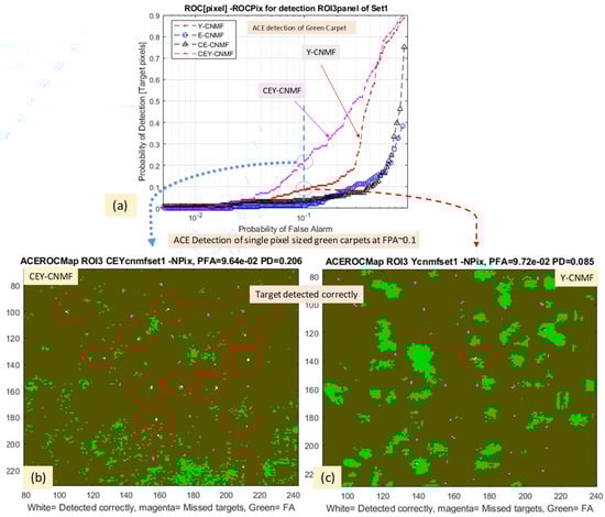 The effectiveness of the proposed R-SRF enhanced CNMF algorithm for the recovery of small occupancy (~0.015) green ceramic targets from the 3.2 m GSD LRHSI scene. (a) The ROC for the detection of the green ceramic targets by all algorithms. Lower panel: the false color detection maps at a PFA of 0.1 for the scenes sharpened by CEY-CNMF (in (b)), which exhibited over an order of magnitude better target detection performance than Y-CNMF (in (c)).