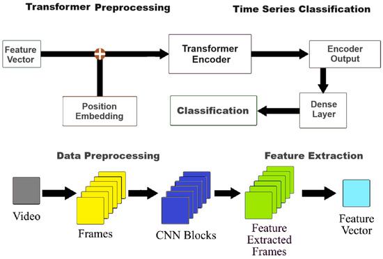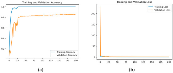 To reduce computation time, we resized each frame of the videos into a fixed height and width after reading them from the dataset. Additionally, we normalized the data to the range [0–1] by dividing the pixel values by 255, accelerating convergence during network training. We generated a list comprising the normalized and resized video frames passed as an argument. While the function processes the video files frame by frame, it does not append every frame to the list because we only require a sequence length from frames that is evenly distributed. In the last step, we split our data to create training and testing sets. We also shuffled the dataset before the split to avoid any bias and obtain splits representing the overall distribution of the data. The number of epochs used for the train/test model was selected to be 200 epochs. The results are shown in Figure 5.