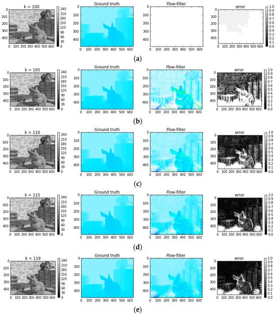 The effect of k filter value on image correction (a) k = 100, (b) k = 105, (c) k = 110, (d) k = 115, and (e) c = 115. The k filter value is a parameter used in the Lucas–Kanade pyramidal optical flow algorithm. The algorithm is used to estimate motion from a sequence of images. The prefiltering step plays a vital role in accurate optical flow computation. Here, k = 115 and k = 119 give the most accurate results.