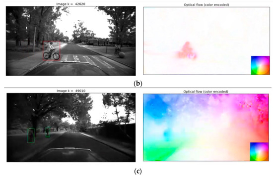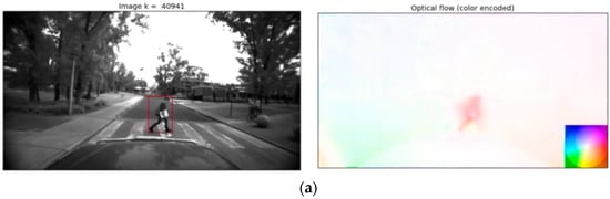 In Figure 7, we can observe the three cases of human behavior in a vehicle-driven sense. The first case is a person crossing the street when a vehicle passes (Figure 7a). The right side of Figure 7a shows the optical fields of sense and it is shown that the person’s optical view and the direction of flow would be in the x+ direction which means that the person may be passing perpendicular to the vehicle path, which means that the vehicle should stop (red box). In the second case (Figure 7b), the bicycle driver crosses the street. The optical flow bicycle driver motion is also in the x+ direction, so the vehicle should also need to stop (red box). In the last case (Figure 7c), there are some people that are walking parallel to the vehicle motion (y+ direction), so this is not dangerous as the humans do not try to cross the street and the system identifies that there is no danger (green box).