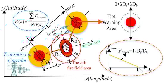 where and (t) are the failure probability dynamic factors of the two adjacent transmission towers in the transmission line, respectively [8], and are the fire points numbers within the influence range of the two adjacent transmission towers, respectively, and is the total number of fire points in the specific area.