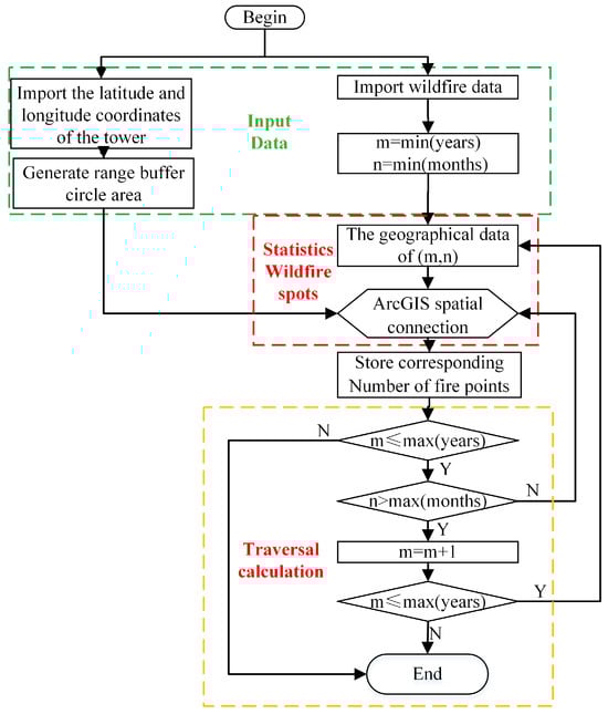 It can be seen from the line failure probability calculation model under wildfire conditions proposed above that a major difficulty in the implementation of this model lies in the rapid and accurate calculation of the number of fire points in the circular buffer zone of all transmission towers. With the recent advancements in satellite remote sensing technology, such as the MOD14 product (wildfire/temperature anomaly detection) in the Modis series developed by NASA and the Fengyun-3 meteorological satellite, real-time monitoring of forest fires every 5 min has become possible [17,18,19]. The fire point data obtained by satellites consist of historical longitude and latitude coordinates of fire points in a specific year and month. Efficiently utilizing existing satellite data to count the number of fire points within specific buffer zones is an urgent issue that requires resolution. It is also urgent to address the issue of obtaining accurate mountain fire point data. Probability calculations and essential operations are crucial for rigorously assessing risk. Therefore, this paper proposed an algorithm for calculating the number of fire points in the buffer zone of automated batch transmission towers using ArcGIS. It also included practical development and processing on the ArcGIS platform [20]. The automated batch retrieval algorithm process developed based on the ArcGIS platform is shown in Figure 2.
