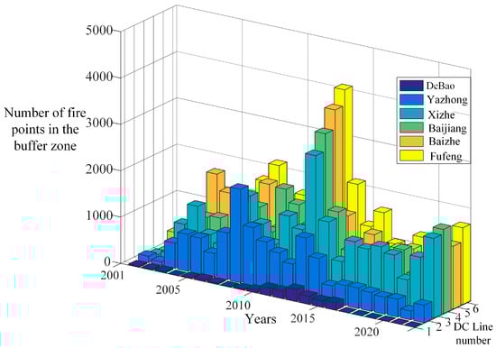 The source of the wildfire coordinates and longitude and latitude data in this example was MODIS data [25]. Figure 3 illustrates the distribution of wildfire spots by year in the buffer zones of six HVDC transmission lines from 2001 to 2022.